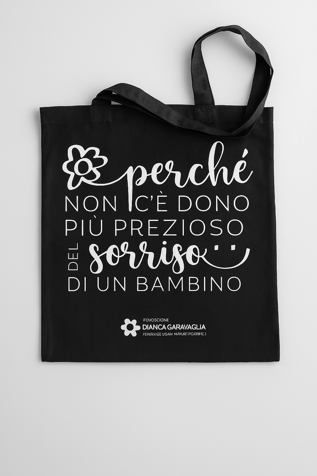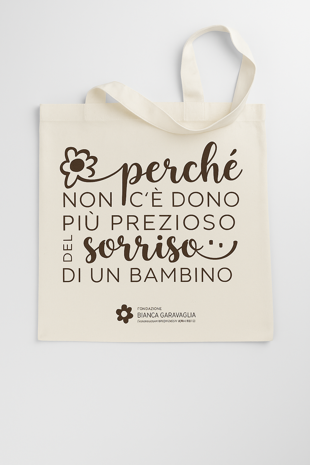 Borsa 100% in cotone stampata con frase “perché non c’è dono più prezioso del sorriso di un bambino”