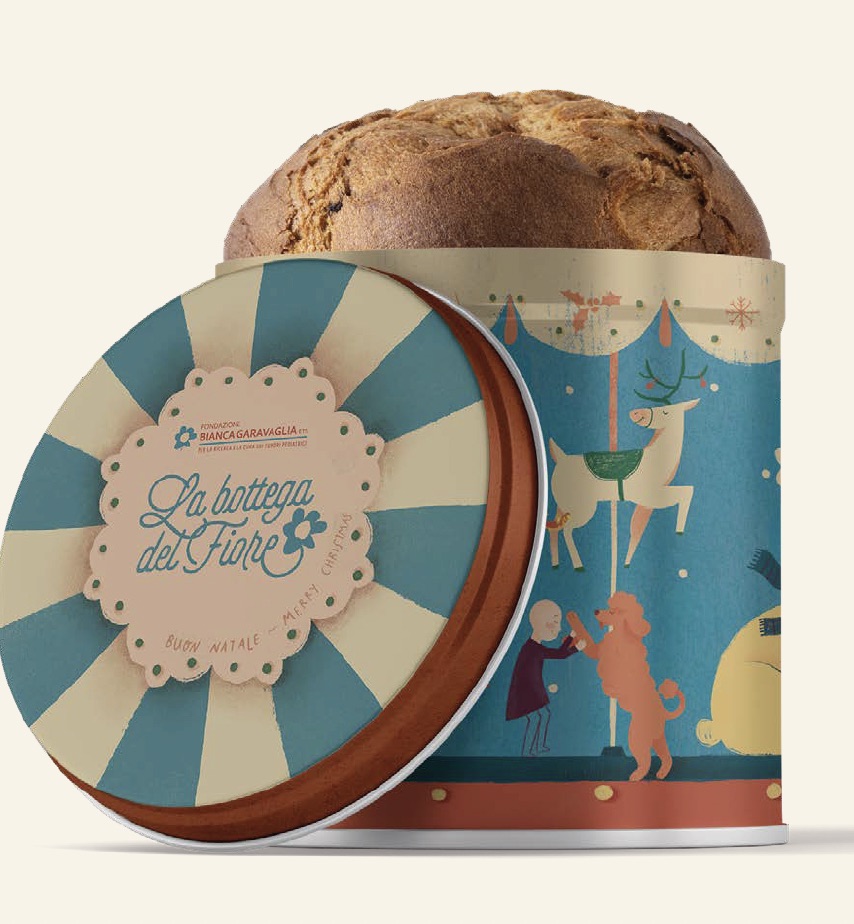 La confezione in latta riutilizzabile che lo contiene è stata realizzata dall’illustratrice Serena Viganò, ed é ispirata alla magia delle giostre e del Natale dei bambini.